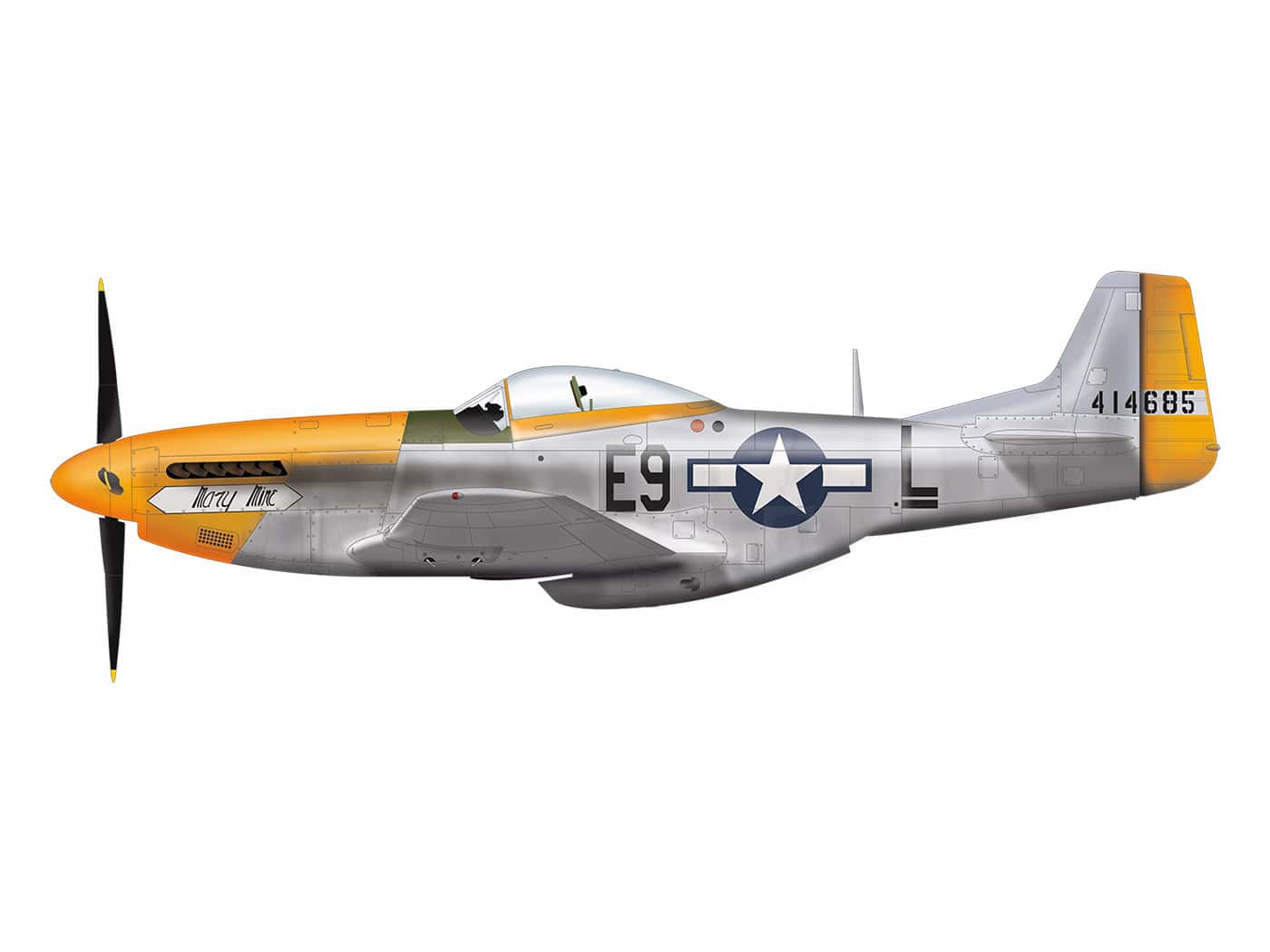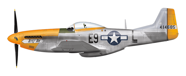 “Mary Mine” is a yellow nose P-51D-10NA Mustang with serial number 44-14685 of the 376th Fighter Squadron, 361st Fighter Group. It was flown by 1st Lt. George Vanden Heuvel and stationed at Chièvres Airfield. The canopy framing, most of the rudder and the nose are painted deep yellow. It carried a bar under the “L”, aft of the national marking on the fuselage.