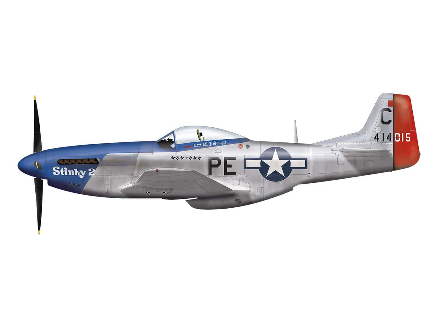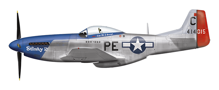 “Stinky 2” is another blue nose P-51D-10NA Mustang with serial number 44-14015 that flew with the 328th Fighter Squadron, 352nd Fighter Group. It had a red painted rudder and carried 6 victory markings. It was flown by Capt. Williamm J. Stangel out of Chièvres Airfield.