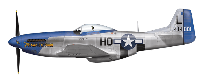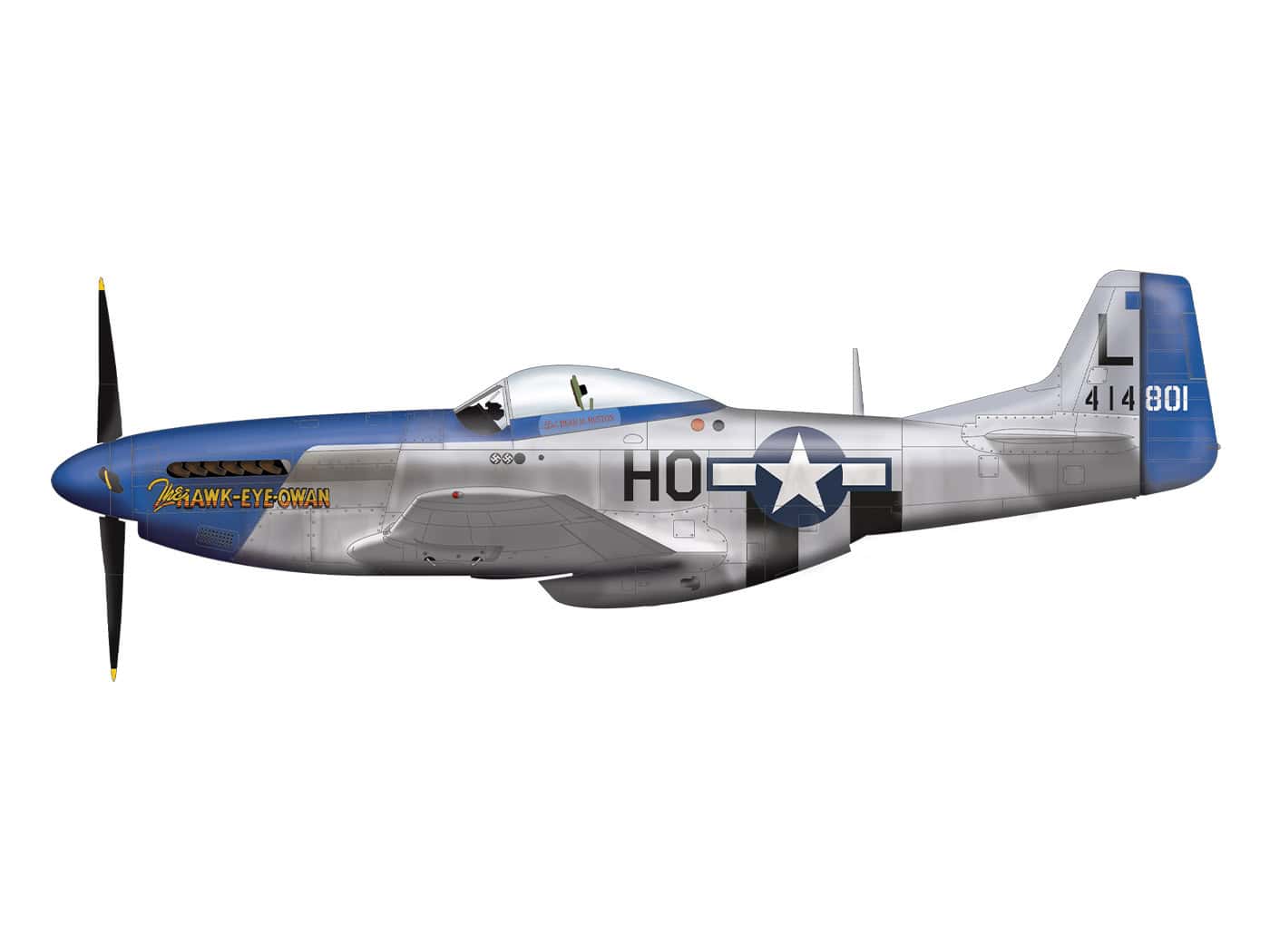 “The Hawk-Eye-Owan” is a blue nose P-51D-10NA Mustang with serial number 44-14801 of the 487th Fighter Squadron, 352nd Fighter Group and was flown by Lt. Dean M. Huston and stationed at Opglabbeek Airfield. Huston was from Iowa, hence the nose-art “Eye-Owan”. On January 1, 1945, Huston attacked incoming Luftwaffe fighters during Operation Bodenplatte. The unit shot down 23 aircraft, with only 2 Mustangs damaged.