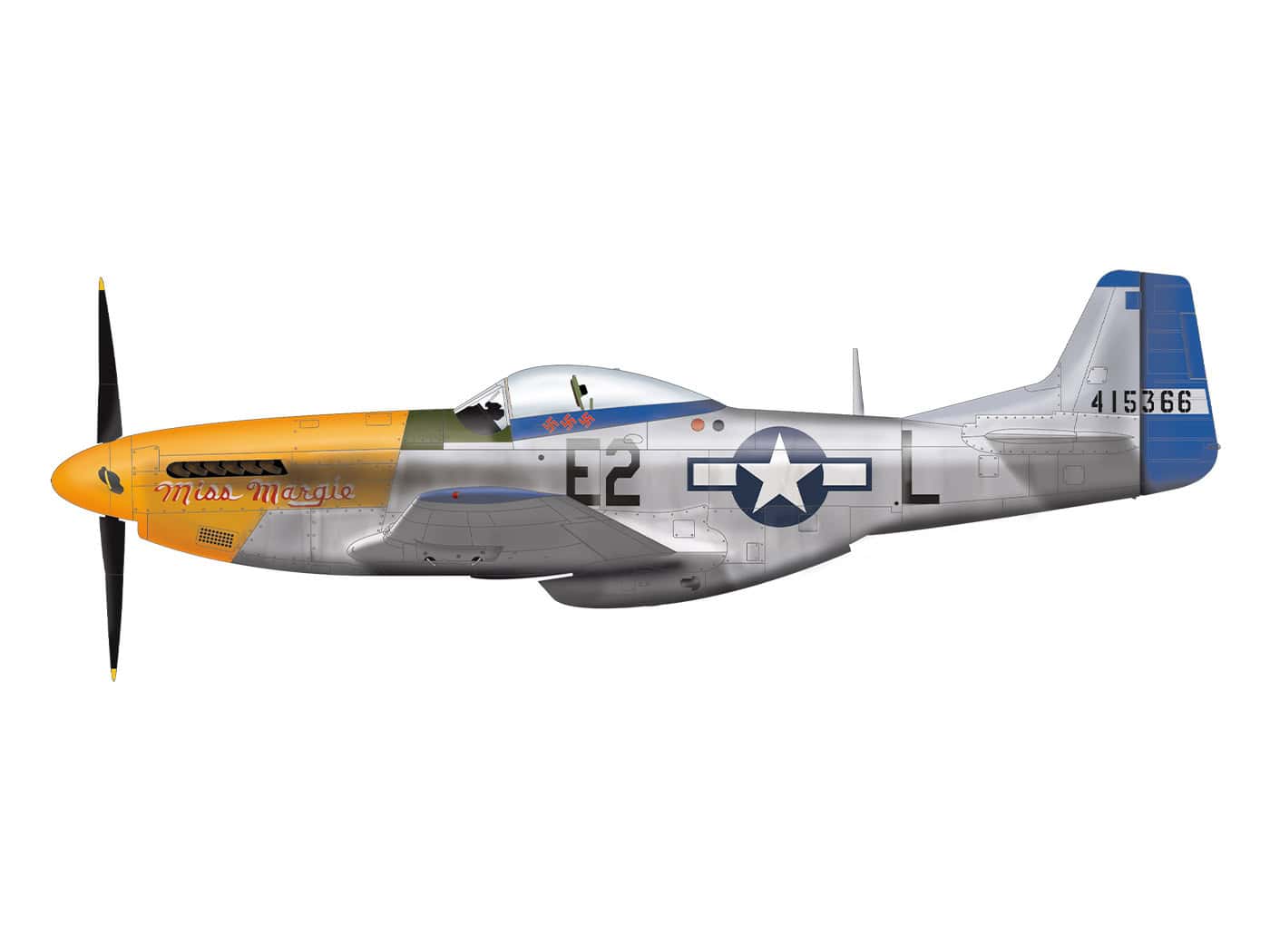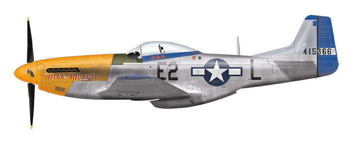 “Miss Margie” is a P-51D-15NA Mustang with serial number 44-15366 that flew with the 375th Fighter Squadron, 361st Fighter Group and was flown by Major Charles N. Keppler, who was based at Chièvres Airfield in the early days of 1945. It had a dark blue rudder and canopy framing. The wing tips and tip of the fin were also painted dark blue.