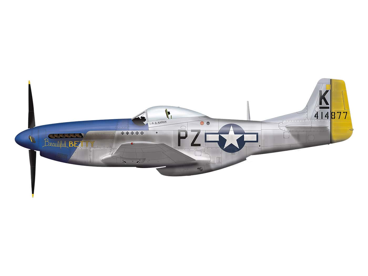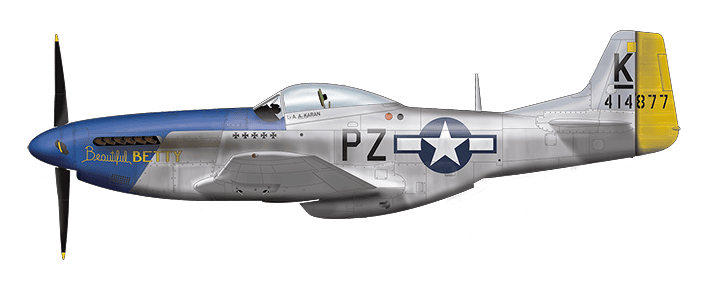 “Beautiful Betty” is a blue nose P-51D-15NA Mustang with serial number 44-14877 of the 486th Fighter Squadron, 352nd Fighter Group. It carries the name of Lt. Alex Karan on the canopy rail and 5 victory markings. It has a yellow rudder and has the code PZ – K with a bar. On April 12 1945, the aircraft looped during landing at Chièvres Airfield. While the pilot survided, the aircraft was badly damaged.